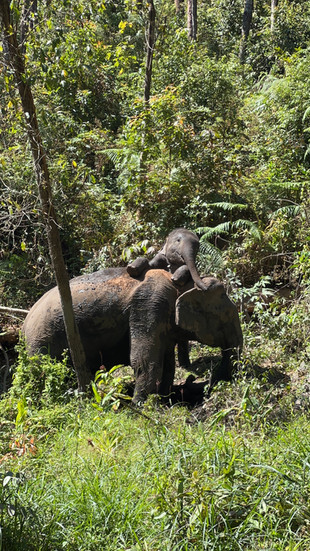 Elephant Land is the company I booked my sanctuary experience through. I was very skeptical of supporting any of the elephant interactions as many of them are not ethical, although they will preach that they are. I booked this through my hostel and it ended up just being me and one other person. I felt that this experience was overall very ethical as they only offered two times frames, one in the morning and one in the evening. When we arrived they gave us traditional clothing that their tribe members have worn through history as it created a sense of familiarity with the elephants. We fed them bananas and leaves before going on a hike through the woods. The elephants would be somewhat guided but were left to roam freely in nature. My new friend Luke and I got to watch them play in the mud and river while interacting with their elephant family. Afterwards we went back to the hut to eat lunch and have our food stolen by the baby elephant. We also learned how to make medicinal treats for the elephants that were all organic and natural. We hung out in some hammocks and continued just observing the elephants in their element. Then we gave them a mud bath and rinsed them off under a waterfall. They rotate out all the elephants so only one gets bathed a day as to not over do it. This is something they generally do in nature on their own as we observed, we just got to be apart of the interaction. Elephants mud bathe regularly, sometimes daily, depending on the temperature and availability of mud. It’s a crucial part of their natural routine, as the mud provides essential protection against the sun and insects.